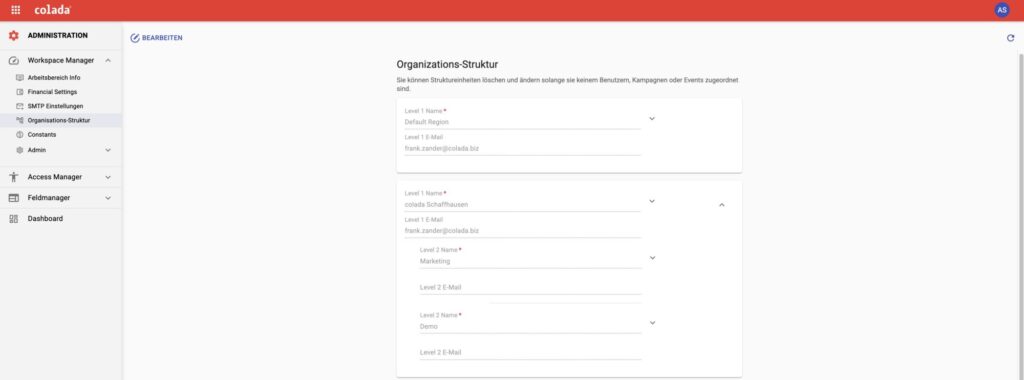 Of course, third-party access to applications can be regulated in the traditional way via a rights system. However, this is often not enough in event marketing. It is not just about managing rights, but also about the targeted allocation of resources, the definition of workflows and the organization of sensitive data. This is precisely where colada’s organizational structure comes in. It was originally developed for the complex requirements of the sports hospitality sector and is now a central component of the platform – although it is not a must for use.