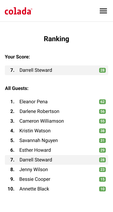 The ranking list is of course the most important thing! Names can be written out in full or anonymized – your own name always appears at the top. You could also show who has already answered how many % of the questions. Other creative ideas can be incorporated from here.